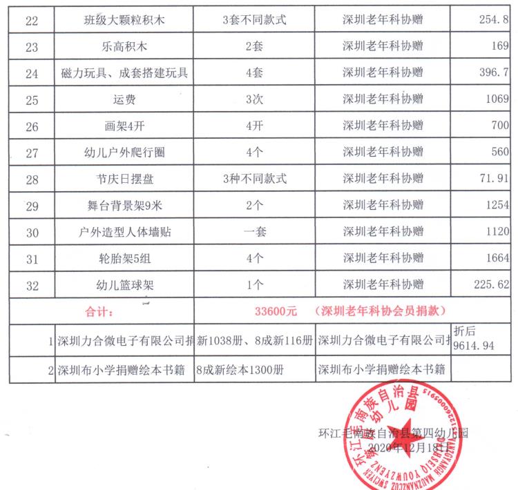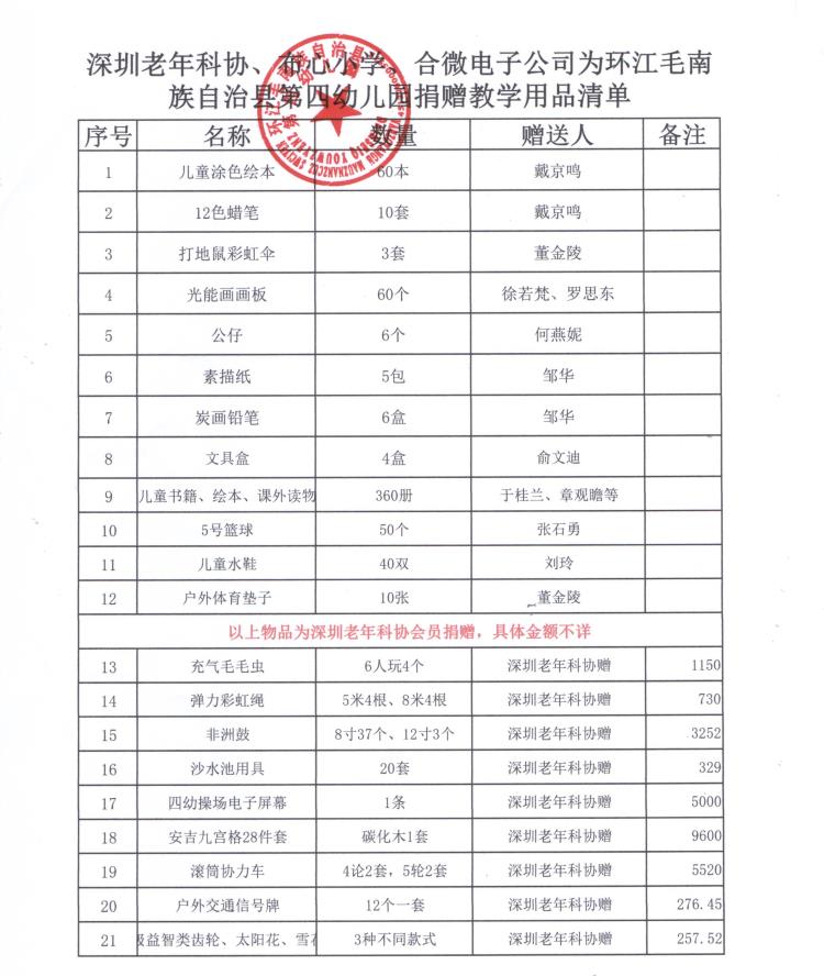 上图为深圳老年科协、布心小学、力合微电子公司为环江四幼捐赠清单