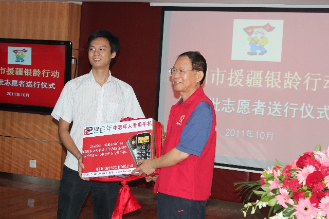 | 上图为爱心企业---深圳市盛中锐实业有限公司代表向志愿者赠送老年手机 |