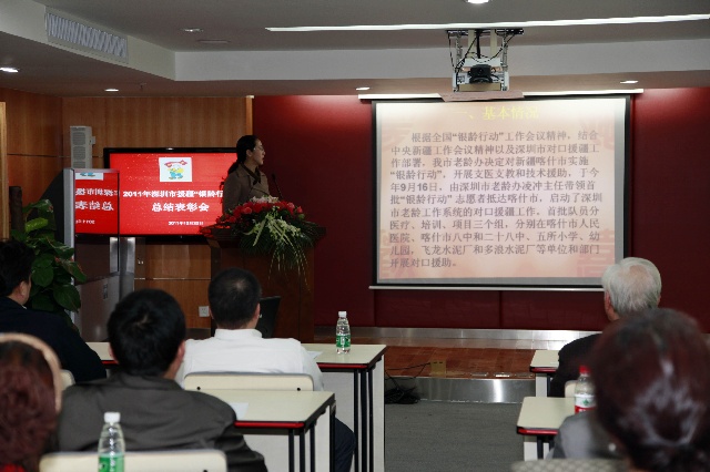上图为深圳老年科协张秋惠秘书长做“2011年深圳援疆‘银龄行动’工作总结”