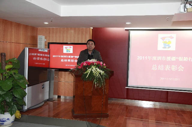 2011年12月22日下午在市民政局十七楼会议室,举行了2011年深圳市援疆“银龄行动”总结表彰会。喀什市民政局、老龄办领导出席了会议,并转赠了喀什市飞龙股份有限公司向深圳市民政局及深圳市老龄办表示谢意的锦旗和感谢信。会议首先由承办单位深圳老年科协做了“银龄行动”工作总结,之后民政局领导为评出的十佳“银龄之星”颁发了奖状和奖金。“银龄之星” 主任中医师主任蒋瑞峰、深圳市物理学科带头人张天麟老师、高级经济师顾大公分别代表医疗组、培训组及项目组介绍了援喀期间的工作情况。