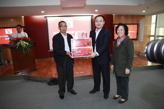 上图为南京中科集团深圳分公司副总经理丁子阳先生向志愿者代表赠送营养保健品