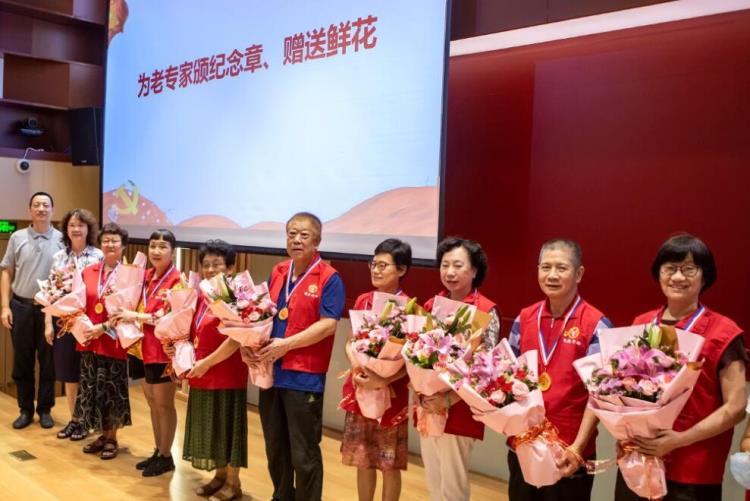 上图为参加培训欢送会的10名老专家合影 领队石丹主任带领老专家宣读了出行誓词:乡村振兴,不忘初心。在即将启程奔赴广西之际,我们庄严宣誓:我志愿参加“银龄行动”,开展人才援助。遵守活动规定,执行服务协议,认真填记工作日报,全心全意做好传帮带,发挥示范作用。在团结友爱的氛围中完成援助任务,为广西乡村振兴再立新功! 接下来市委老干部局宋静杰副局长为老专家献花,市科协孙楠副巡视员、市卫生健康委杨树林处长为老专家颁发了纪念牌。