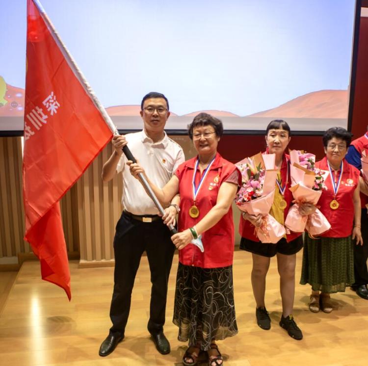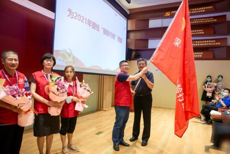 上图为市科协孙楠副巡视员讲话 “银龄行动”得到了中共深圳市委老干部局的支持和推荐,宋静杰副局长去年也参加了在科学馆举办的第二批“银龄行动”培训欢送会,与会人员用掌声感谢市委老干部局及宋局长一直以来对“银龄行动”的指导支持! 四、颁牌献花授旗 2021年深圳市援助广西“银龄行动”10名老专家登场(其中8人因从外地出发及家中事务请假):到百色市凌云县支医的石丹领队、刘明华、谢慧媛、吕慧敏;到河池市东兰县支医的何丽娟、包玉柱;到河池市巴马县支医的孙立宏、陆风华、张月、卢明。