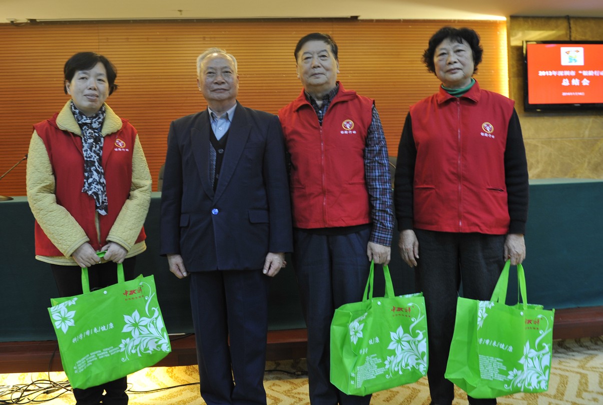 | 老志愿者们的爱心援助感动了爱心企业,南京中科集团深圳分公司向志愿者代表赠送营养保健品,深圳市上善科技有限公司聘请15名老医生为该司的“易百年”健康大使,并由董事长苏晓勇为老医生颁发了聘书。 |