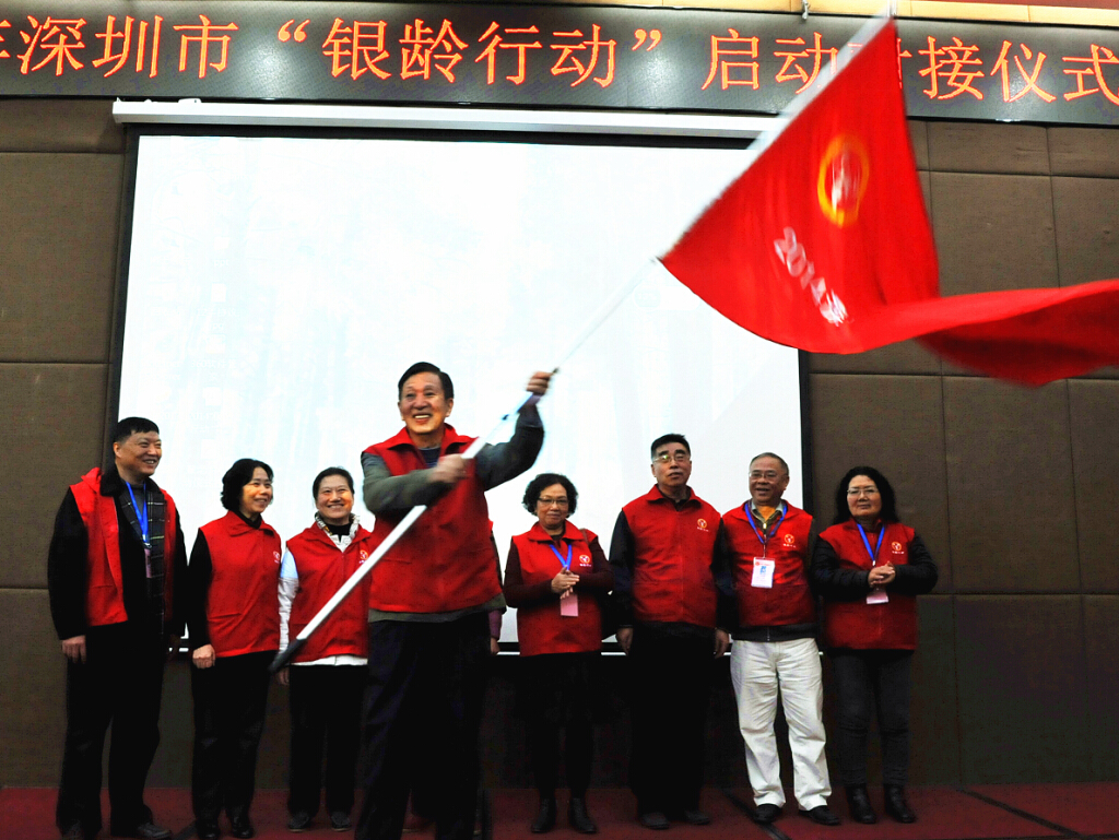 | 之后,社区代表、民校代表以及企业代表分别为医疗保健组、教学辅导组和科技项目组授旗,各组组长挥旗带队出发,标志着2014年深圳市“银龄行动”正式启动。 |