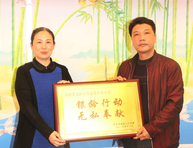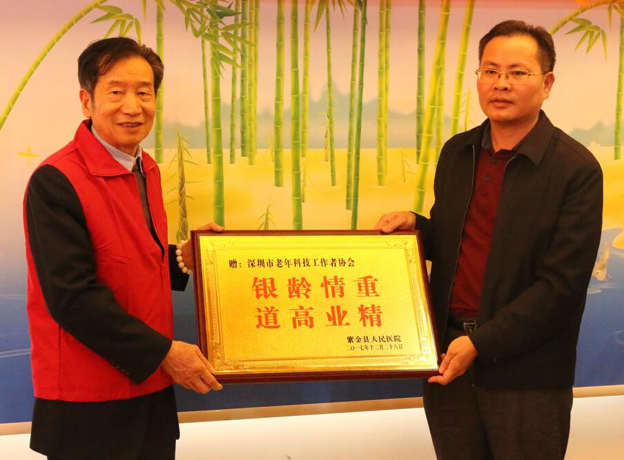 | 紫金县人民医院、紫金县城第七小学、河源鸿祺电子技术有限公司等受援单位为表达对“银龄行动”主承办单位的谢意,精心制作了牌匾,由深圳市老龄办沈主任、深圳老年科协张天麟会长代表主承办方领取了牌匾。 |