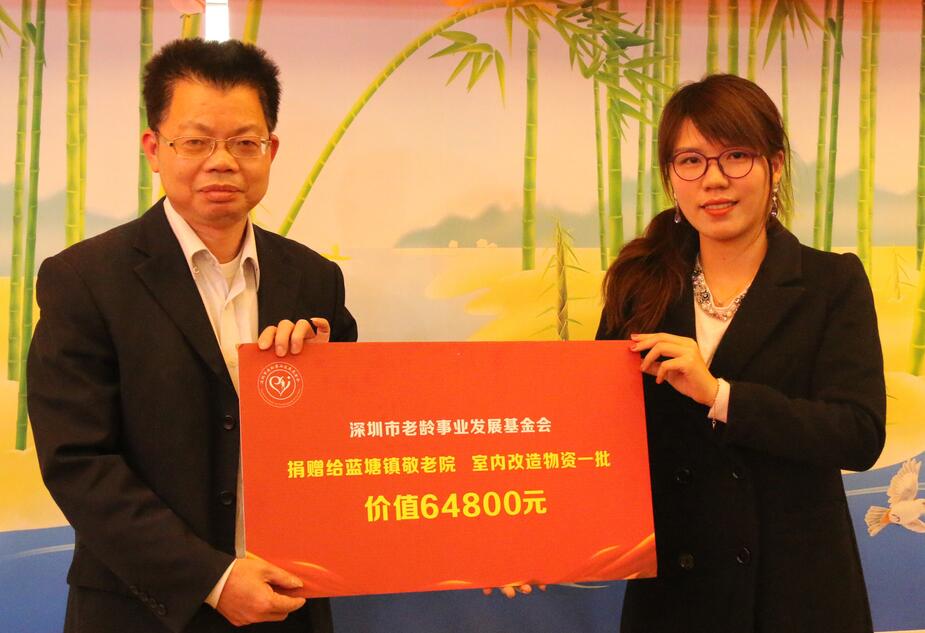 | 上图为深圳市老龄事业发展基金会潘乐总监(右)向蓝塘镇敬老院捐赠物资款 |